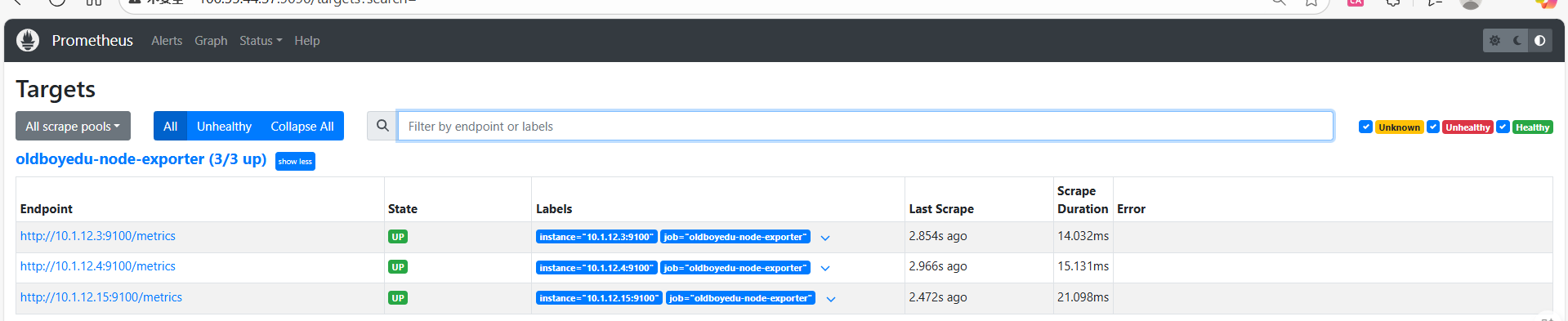 再次访问 Prometheus 的 WebUI ,可以看到我们刚刚添加的 oldboyedu-node-exporter job,并且其下的所有 targets 状态(State)都为 UP,这表示 Prometheus 已经成功连接并开始抓取数据。