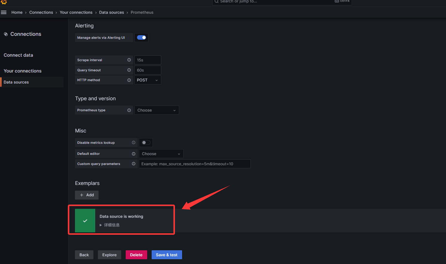 滚动到底部,点击 Save & test。如果看到 "Data source is working" 的绿色提示,说明连接成功。