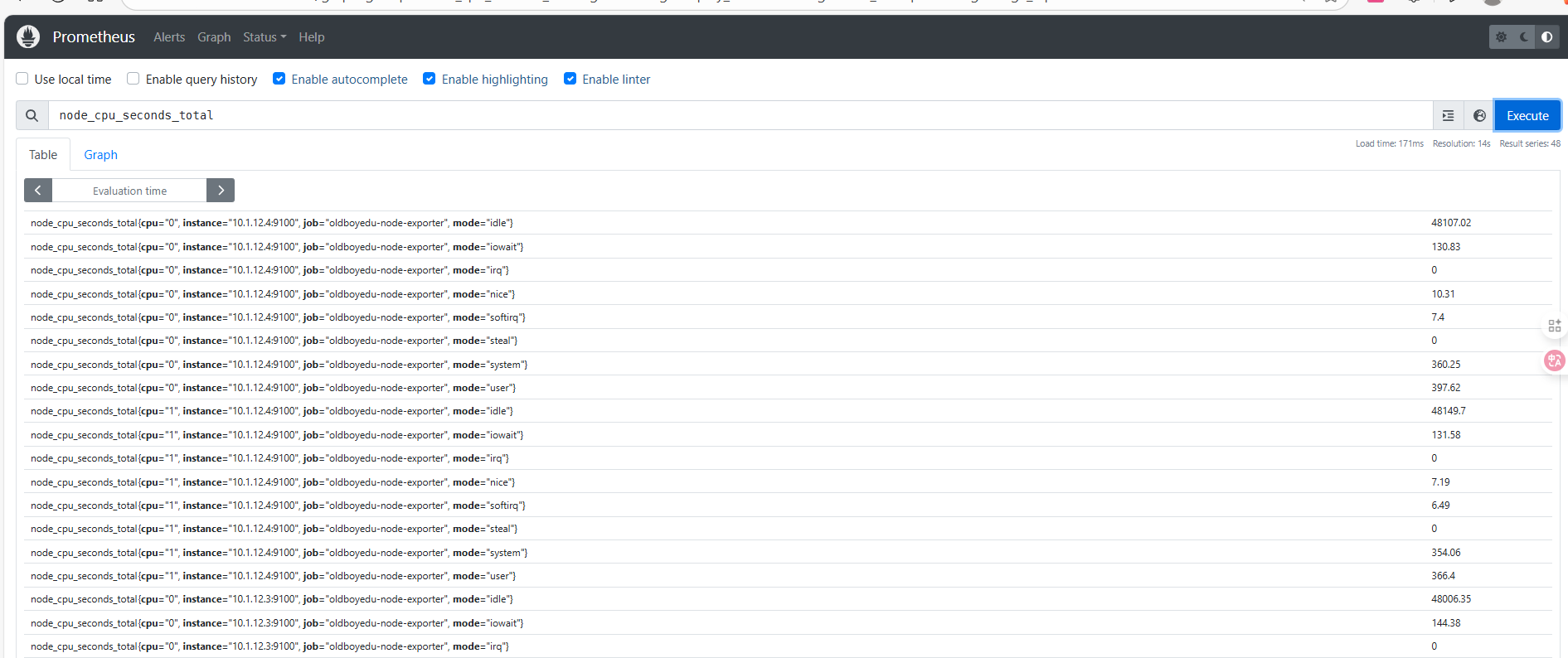在 WebUI 的查询框(Expression)中输入一个指标名,例如 node_cpu_seconds_total,然后点击 Execute。如果能看到返回的数据列表,就证明数据已经成功采集到 Prometheus 中了