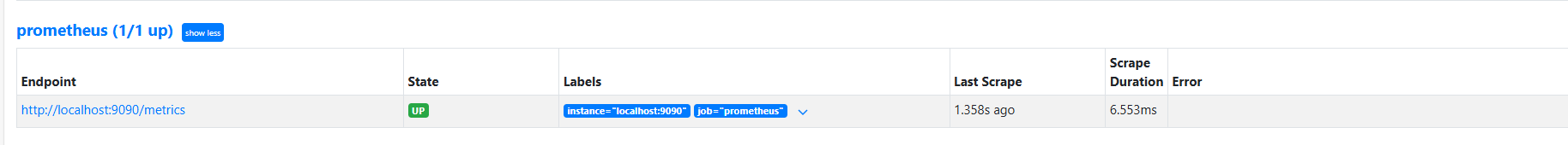 在 WebUI 中,点击导航栏的 Status -> Targets,可以看到 Prometheus 当前监控的目标。默认情况下,它只会监控自己。