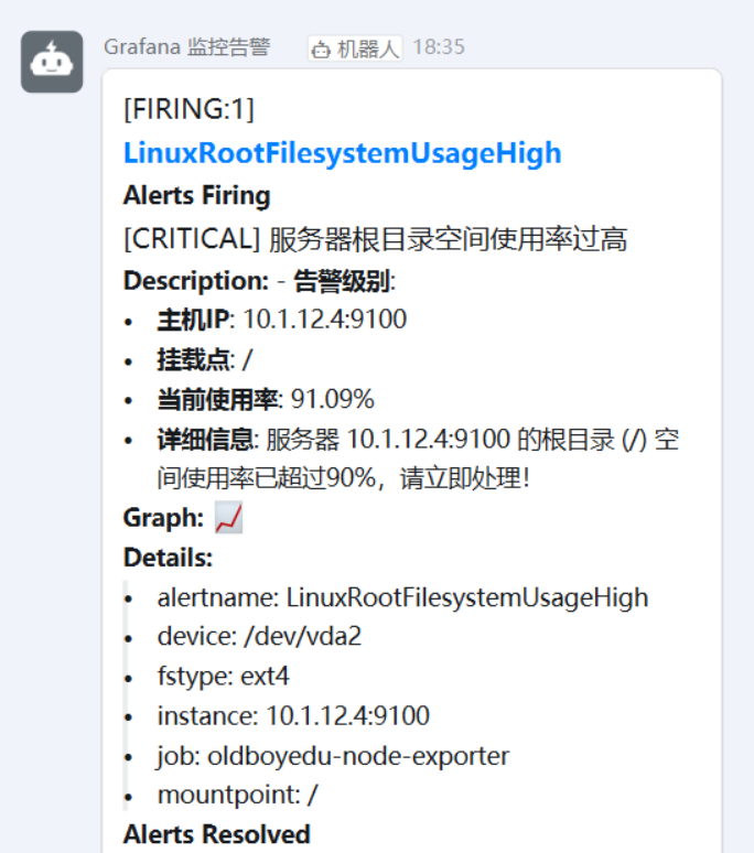 为提升系统运维的自动化和响应效率,我成功构建了一套基于 Prometheus、Alertmanager 和钉钉的自动化告警系统。该系统能够实时监控线上 Linux 服务器的根目录磁盘使用率,并在超出预设阈值时,通过钉钉机器人即时发送告警信息给相关运维团队,实现了从监控、告警到通知的闭环管理。