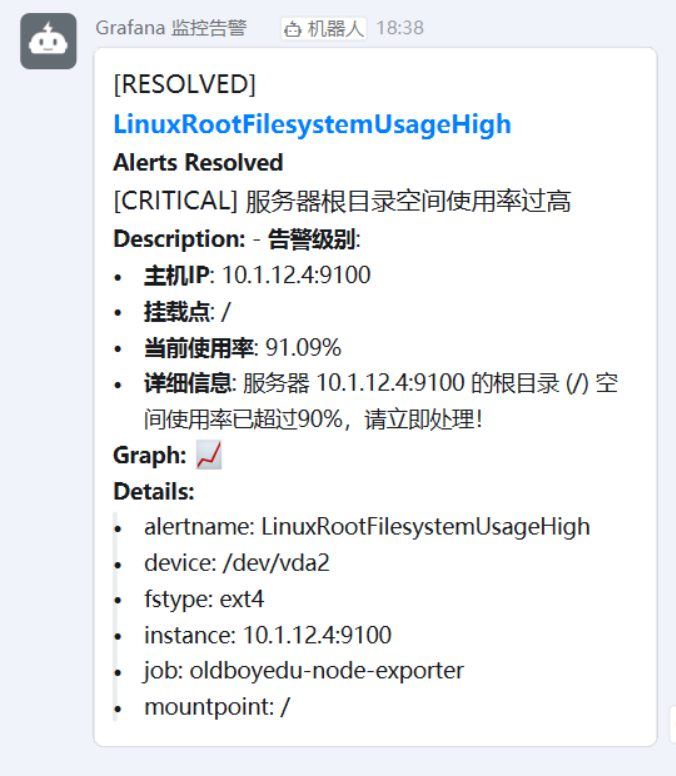 最终实现效果: 监控 -> 分析 -> 告警 -> 推送 -> 解决 -> 恢复通知的全流程自动化。