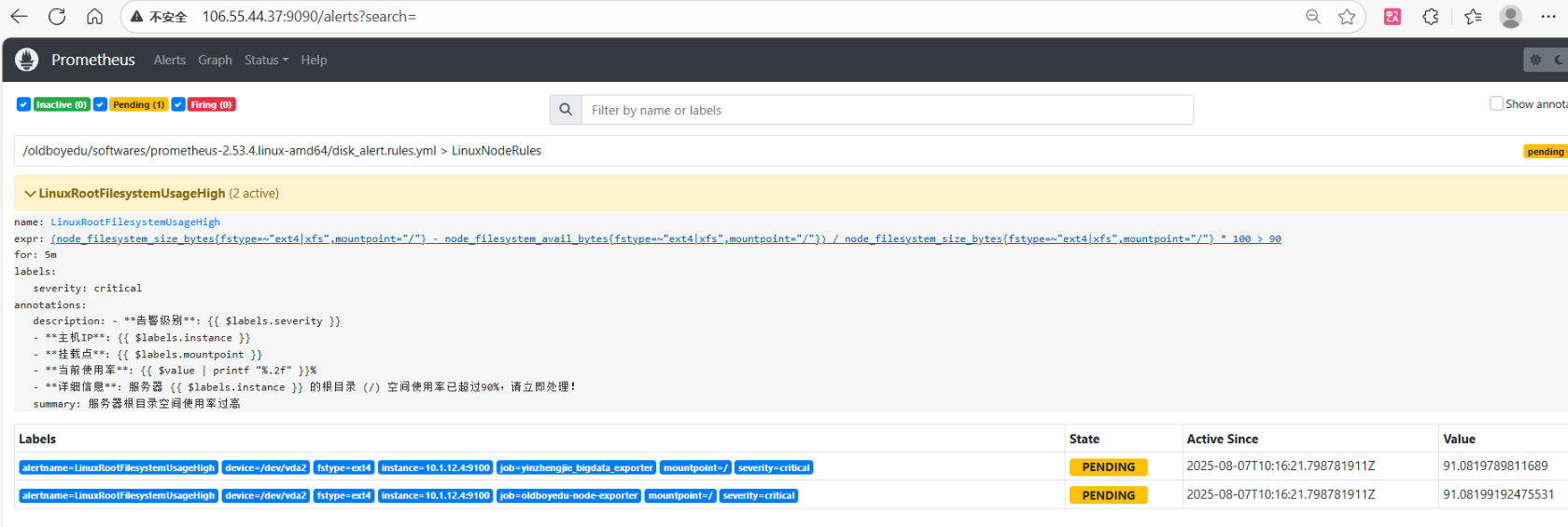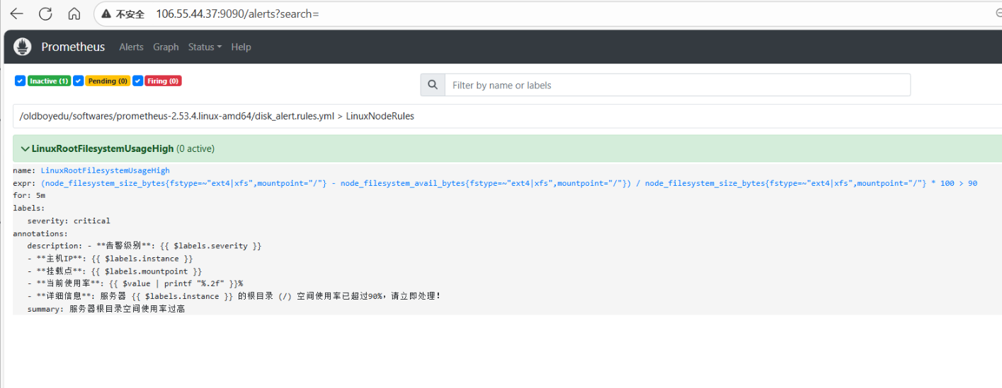 - **详细信息**: 服务器 {{ $labels.instance }} 的根目录 (/) 空间使用率已超过阈值,请立即处理!2.2 更新主配置文件 prometheus.yml