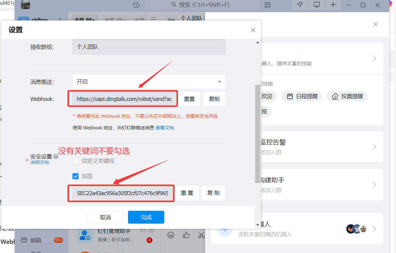 安全设置: 为了安全,务必选择 “加签” 方式。系统会自动生成一个 Secret 密钥。
