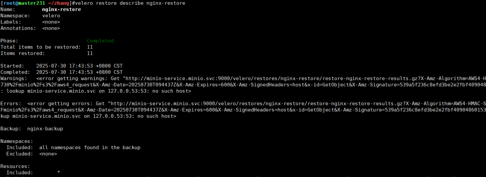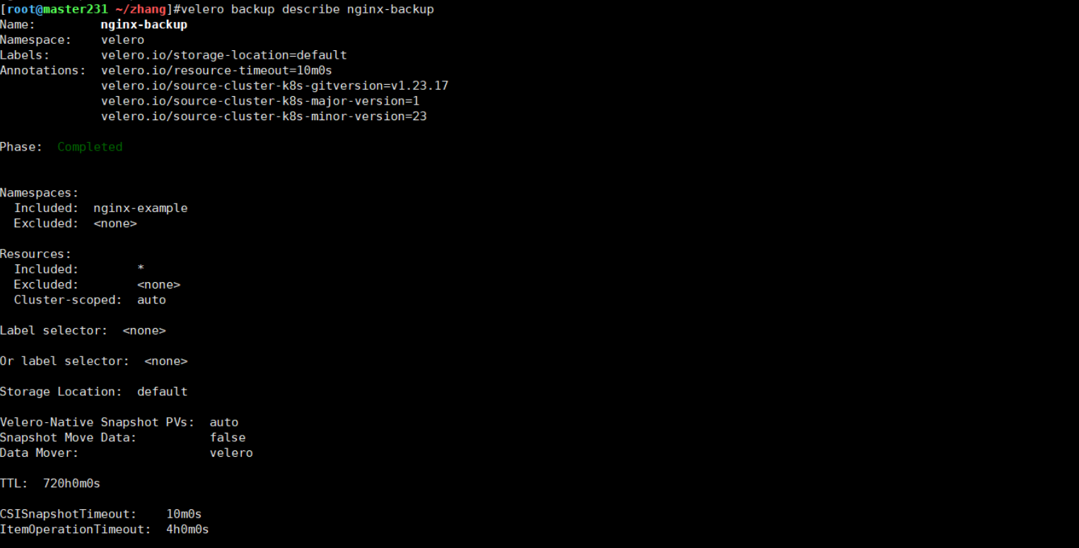 velero backup get当 STATUS 变为 Completed 时,备份就完成了。我还可以用 velero backup describe nginx-backup 看看都备份了些啥。
